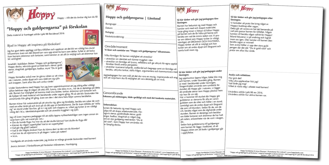 Välkommen att gratis ladda ner och använda detta material, som tagits fram utifrån Lpfö 98 Rev. 2016 och är tänkt att fungera som inspiration och konkret arbetsmoment på förskolan tillsammans med boken "Hoppy och guldpengarna".