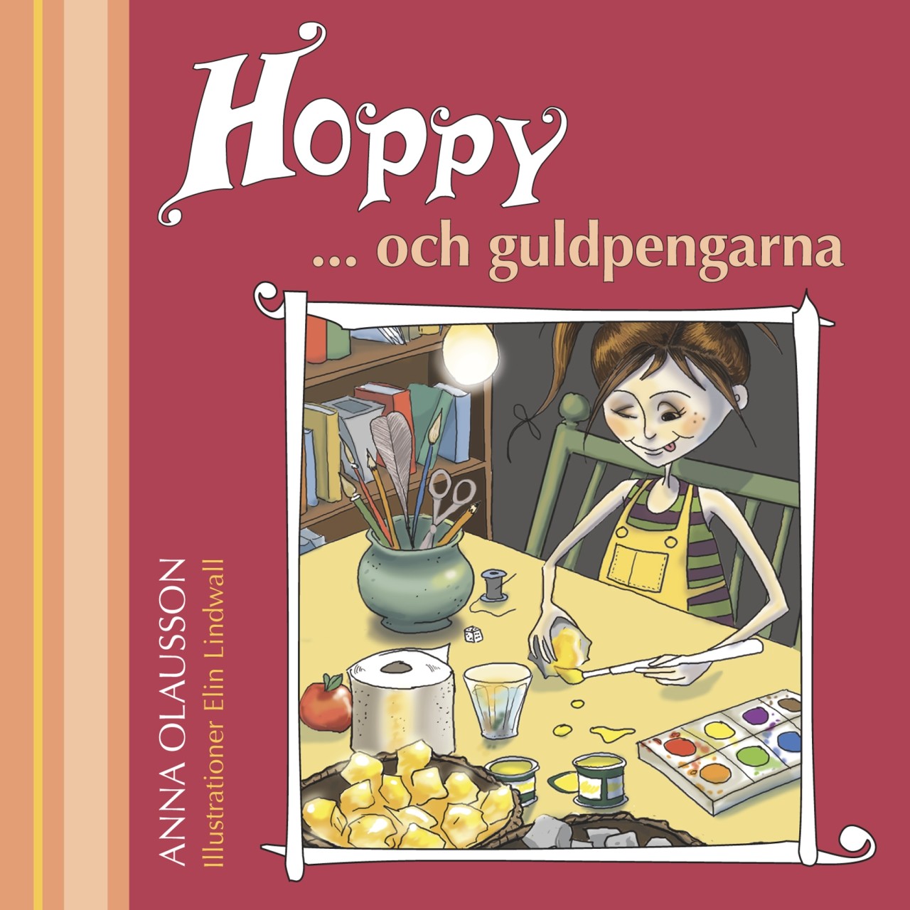 Det kom en bok på posten. Anna har skrivit en bok! En egen! Det är skithäftigt, Anna ba: Nähä, nu har jag en jättebra idé, nu ska jag baskemej skriva en bok! och så gör hon det och ger ut den och allt. Hoppy och guldpengarna heter boken. Handlar om Hoppy som vill bada i guldpengar och som klurar ut hur hon ska lyckas med det.